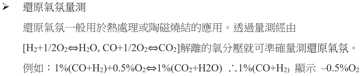 | 利用氧化鋯電極量測高溫 的氧氣濃度。對於像煙道氣體(較髒彧較高溫的氣體)也可以直接量測。 | |