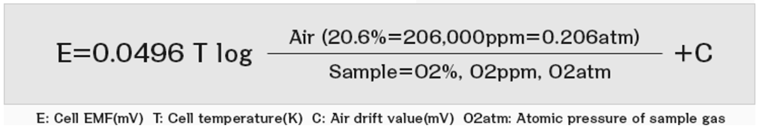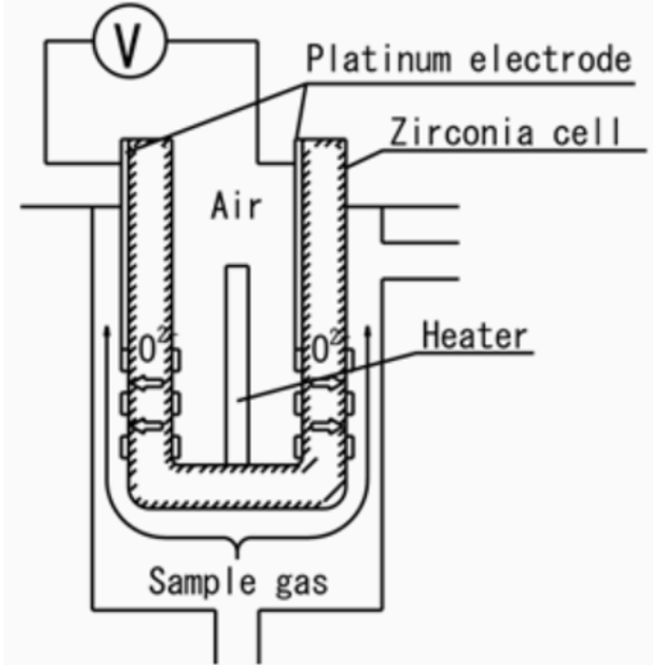 將氧化鋯陶磁加熱後,氧化鋯陶磁會形成電極,氧離子可以穿透氧化鋯陶磁。若是氧化鋯陶磁的內側與外側有不同濃度氣體,在氧化鋯陶磁兩側就會形成電位差。將氧化鋯電極內側接觸空氣當作參考基準,外側接觸待測氣體,就可以經由量測電極內外側電位差來量測氧氣濃度。